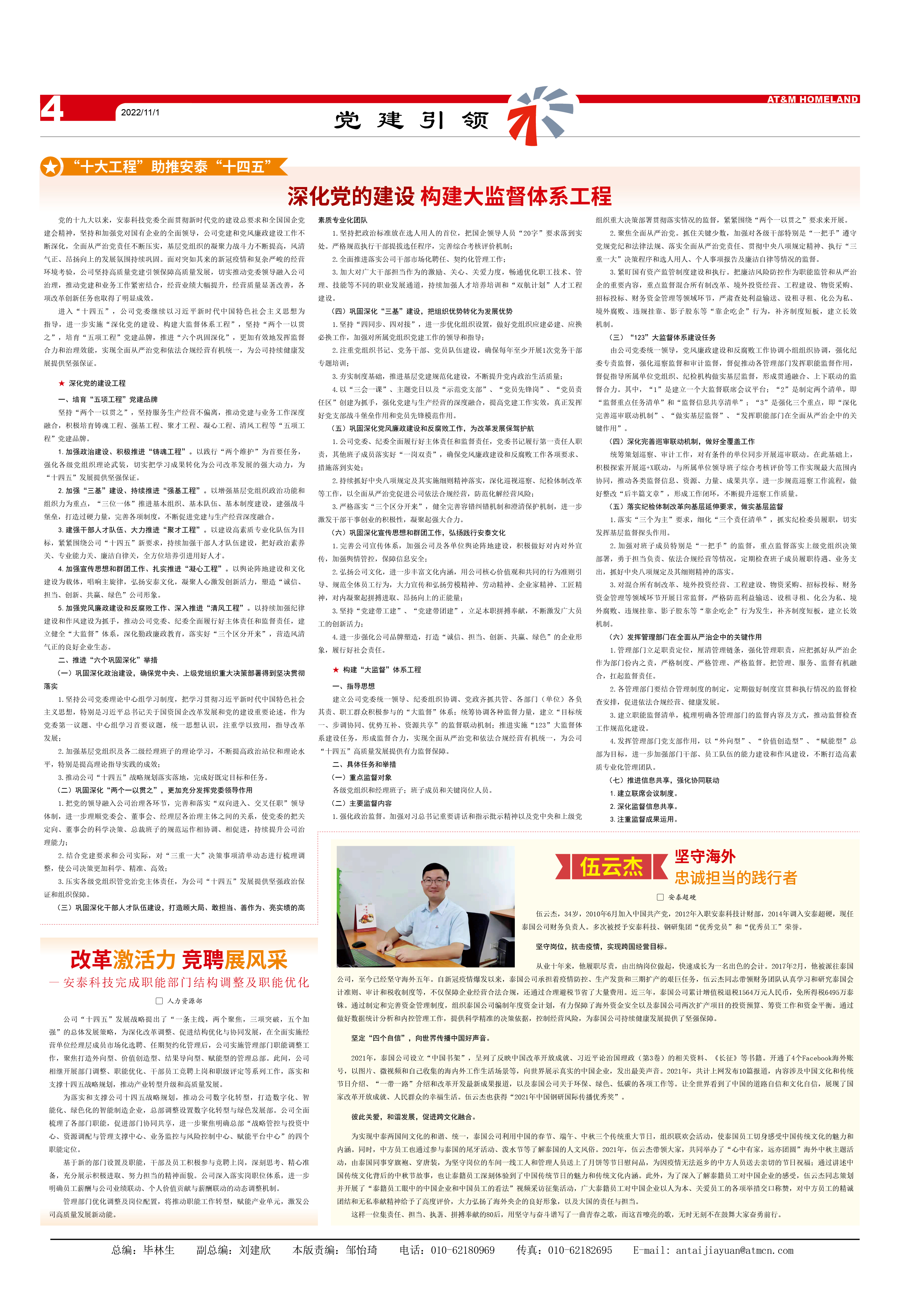 黨的十九大以來,安泰科技黨委全面貫徹新時代黨的建設總要求和全國國企黨建會精神,堅持和加強黨對國有企業的全面領導,公司黨建和黨風廉政建設工作不斷深化,全面從嚴治黨責任不斷壓實,基層黨組織的凝聚力戰斗力不斷提高,風清氣正、昂揚向上的發展氛圍持續鞏固。面對突如其來的新冠疫情和復雜嚴峻的經營環境考驗,公司堅持高質量黨建引領保障高質量發展,切實推動黨委領導融入公司治理,推動黨建和業務工作緊密結合,經營業績大幅提升,經營質量顯著改善,各項改革創新任務也取得了明顯成效。