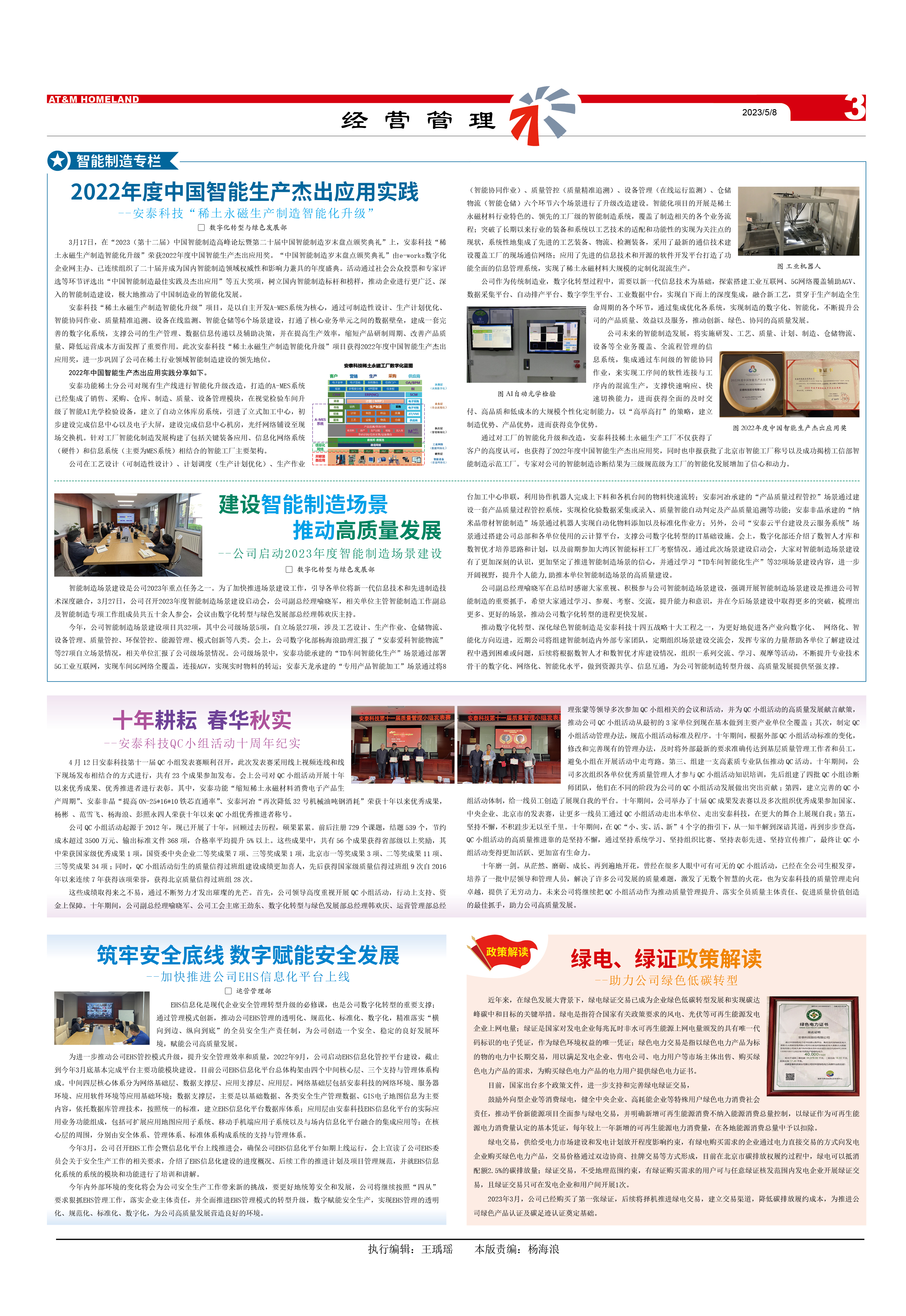 安泰科技“稀土永磁生產制造智能化升級”項目,是以自主開發A-MES系統為核心,通過可制造性設計、生產計劃優化、智能協同作業、質量精準追溯、設備在線監測、智能倉儲等6個場景建設,打通了核心業務單元之間的數據壁壘,建成一套完善的數字化系統,支撐公司的生產管理、數據信息傳遞以及輔助決策,并在提高生產效率,縮短產品研制周期、改善產品質量、降低運營成本方面發揮了重要作用。此次安泰科技“稀土永磁生產制造智能化升級”項目獲得2022年度中國智能生產杰出應用獎,進一步鞏固了公司在稀土行業領域智能制造建設的領先地位。