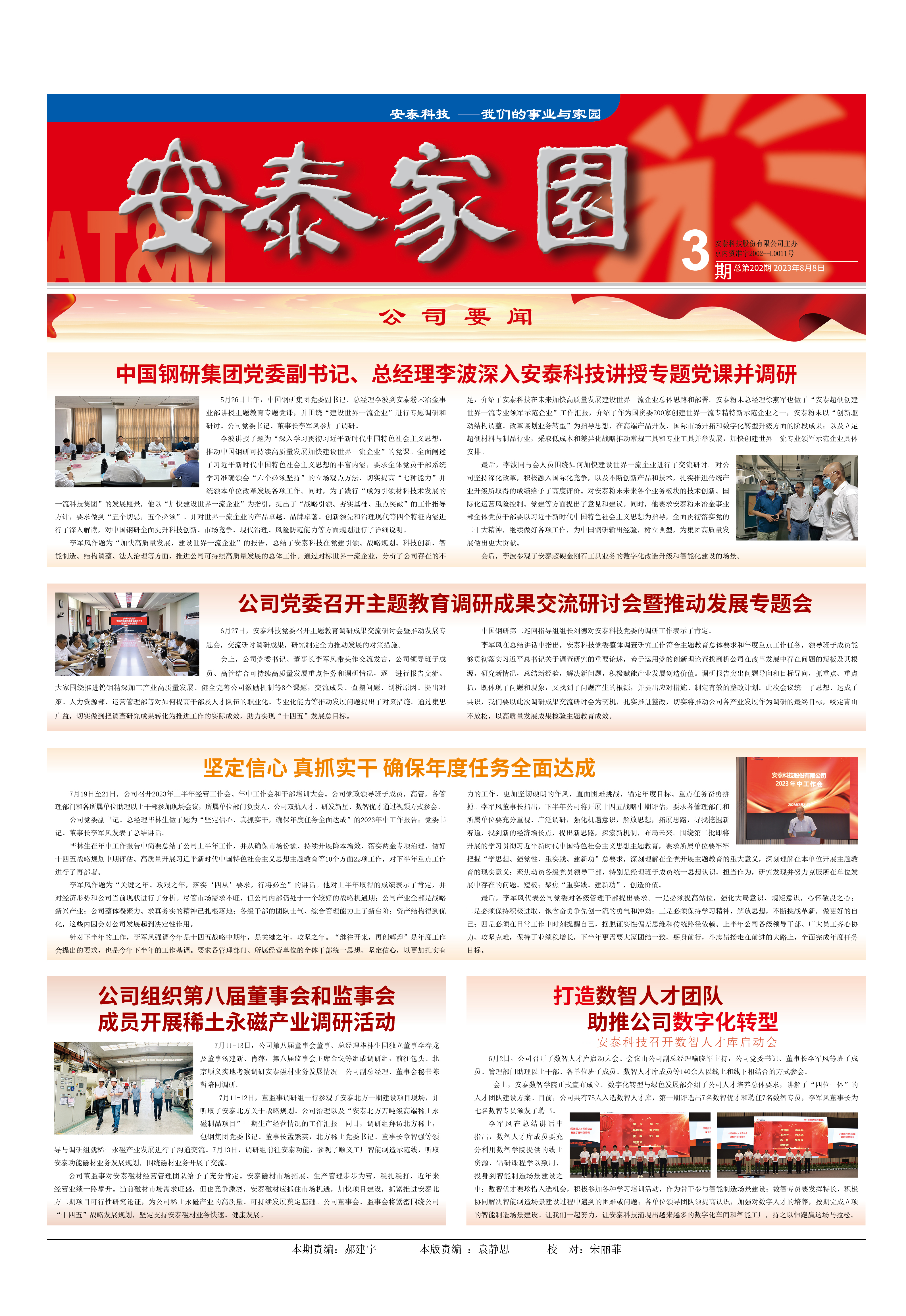 5月26日上午,中國鋼研集團黨委副書記、總經理李波到安泰粉末冶金事業部講授主題教育專題黨課,并圍繞“建設世界一流企業”進行專題調研和研討。公司黨委書記、董事長李軍風參加了調研。