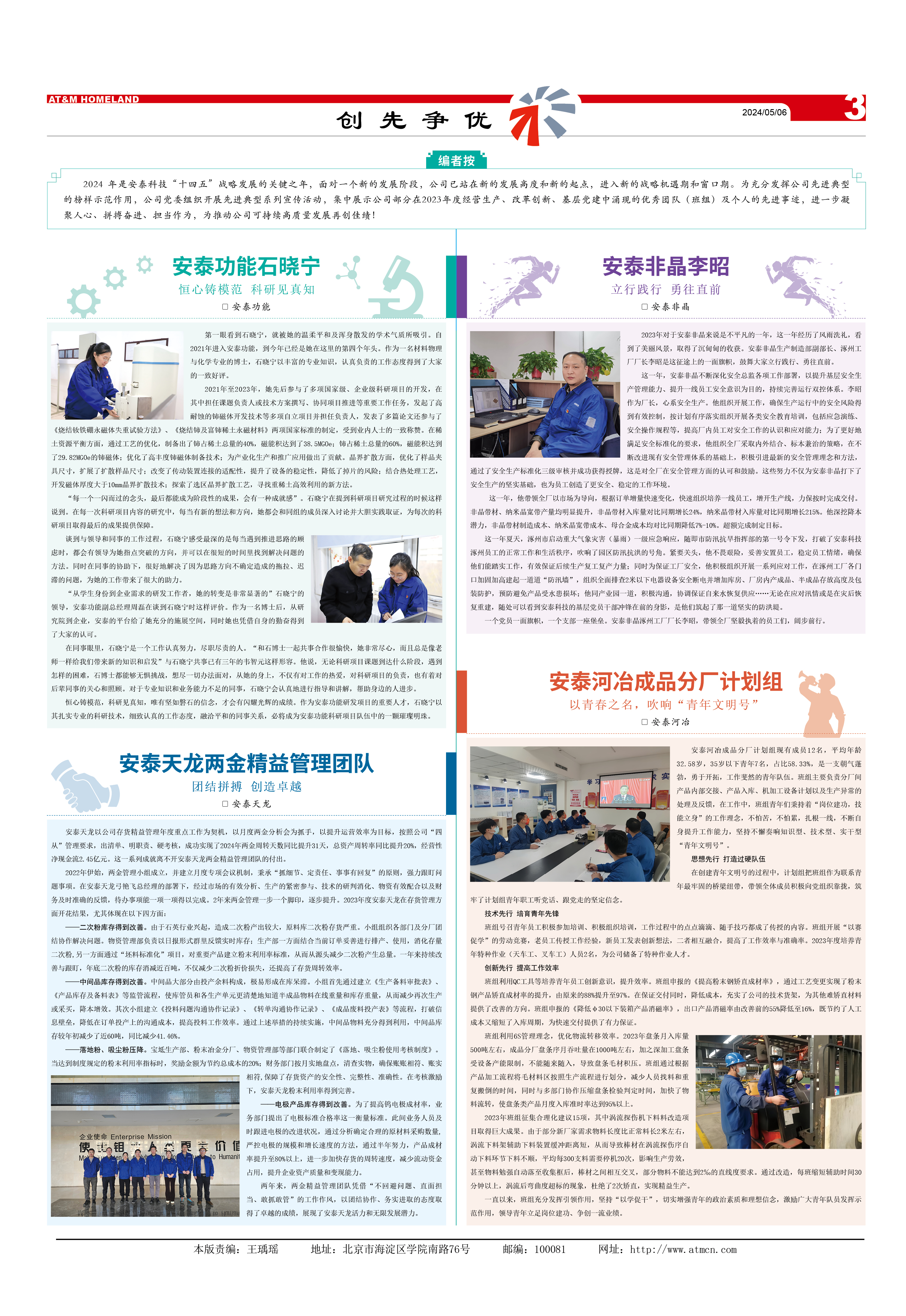 2024 年是安泰科技“十四五”戰略發展的關鍵之年,面對一個新的發展階段,公司已站在新的發展高度和新的起點,進入新的戰略機遇期和窗口期。為充分發揮公司先進典型的榜樣示范作用,公司黨委組織開展先進典型系列宣傳活動,集中展示公司部分在2023年度經營生產、改革創新、基層黨建中涌現的優秀團隊(班組)及個人的先進事跡,進一步凝聚人心、拼搏奮進、擔當作為,為推動公司可持續高質量發展再創佳績!